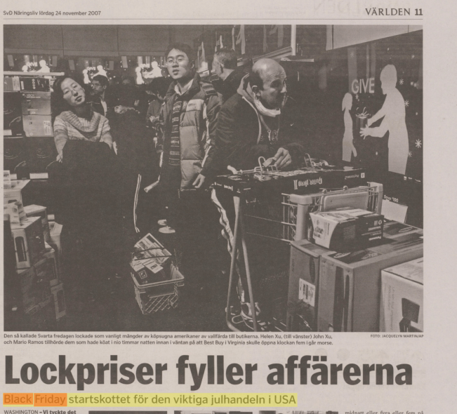 Exakt när termen ”Black Friday” började användas är oklart men sedan 2000-talets början är det en av de stora rea- och shopping-dagarna i USA. I Sverige började det rapporteras om från USA om Black Friday runt 2007. SvD har en helsida den 24 november 2007 med rubriken: ”Lockpriser fyller affärerna”.