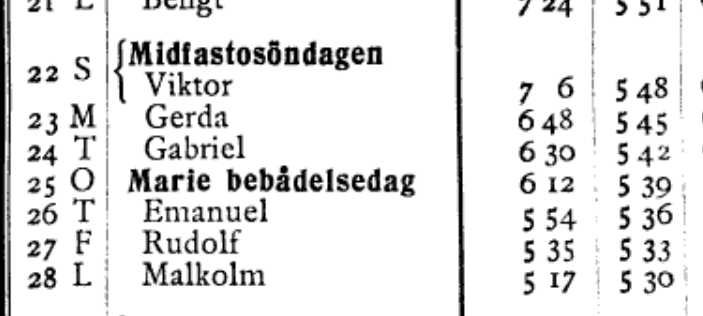 Sedan jungfru Marie bebådelsedag som helgdag flyttats till närmast liggande söndag står ”Marie bebådelsedag” kvar på 25 mars utan någon namnsdag. Och det är dessutom 25 mars som är våffeldagen.