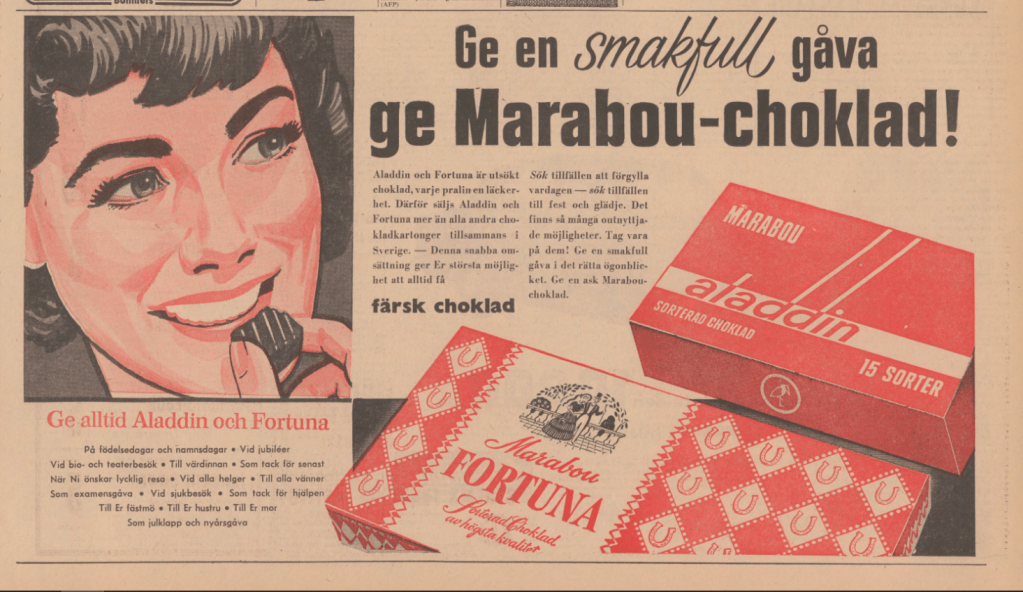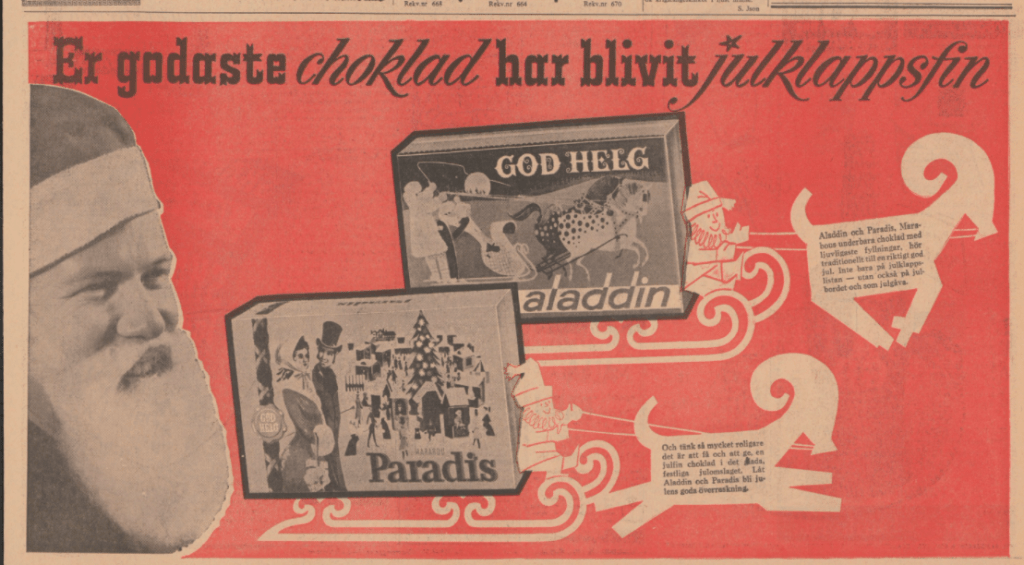 Kort svar: Chokladasken ”Aladdin” från Marabou lanserades som en julchoklad under 1950-talet.
