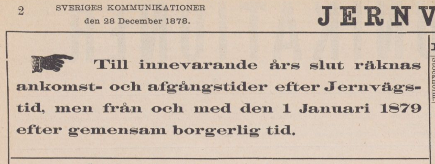 Redan den 31 Maj utfärdade Kongl. Maj:t kungörelse om antagande från och med 1879 af en för hela riket gemensam tidsberäkning, enligt hvilken tiden å alla rikets orter skall såväl i rättsligt som i borgerligt hänseende beräknas lika med medeltiden för den meridian, som är belägen på tre graders eller tolf tidsminuters vestligt afstånd från Stockholms observatoriimeridian