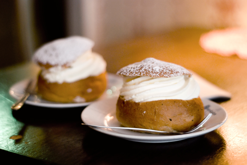 Semlorna siktas över med vanilj- eller florsocker och läggs upp på en servett.