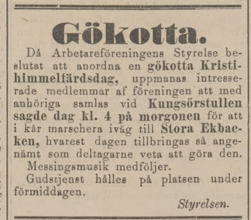 När arbetarrörelsen växte fram under slutet av 1800-talet blev det vanligt att man anordnade gökottor, ”tidig picknick en vårmorgon”, på Kristi himmelsfärdsdagen. Så här skriver Nordiska museet: