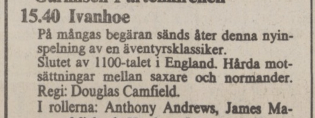 Kort svar: Ivanhoe har visats på svensk teve på nyårsdagen 1986, 1988, mellan 1994-2001 på SVT. Från 2002 och fram till 2021 har den sedan visats på TV3.