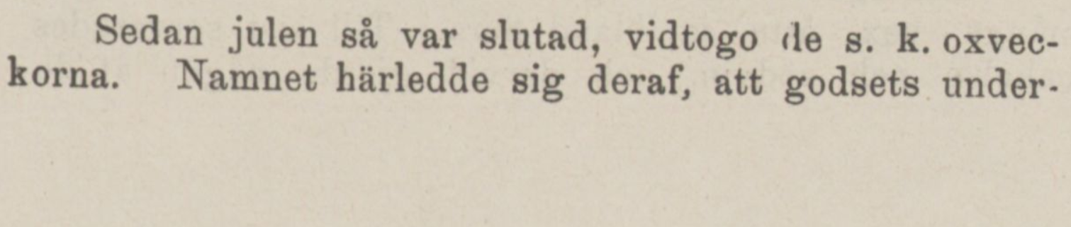En annan benämning som ofta används i januari är oxveckorna. /../ För många både då och nu är tiden efter jul just en sådan slitig tid med långt till nästa extra ledighet.