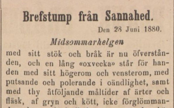 Det äldsta belägget för ordet ”oxvecka” i KB:s tidningsdatabas är från början av juli 1880. Där står det under rubriken ”Brefstump från Sannahed” daterat 29 juni 1880 att en ”lång ‘oxvecka’ står för handen” eftersom midsommarhelgen är överstökad. Här syftar alltså ”oxvecka” på perioden efter midsommarhelgen.