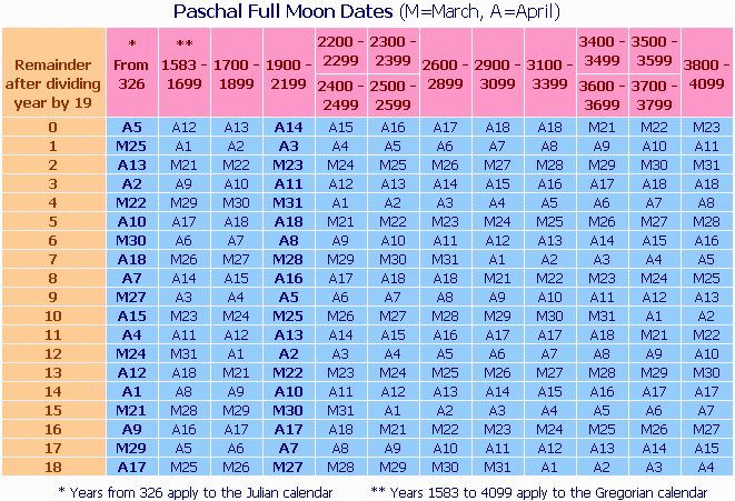 Här följer en tabell över alla påskfullmånar mellan år 326 och år 4099.