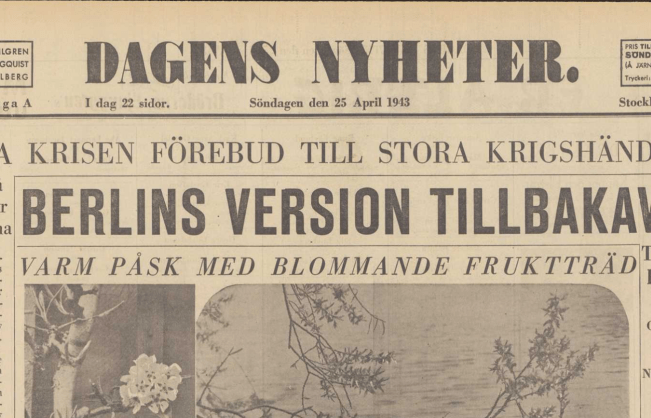 DN:s förstasida på påskdagen 1943, senaste gången påsken var så sen som 25 april.