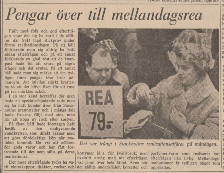 Första gången som mellandagsrea förekommer i SvD är 1965. Där rapporteras om hur det varit ”fullt med folk” första dagen på mellandagsrean (27 december).