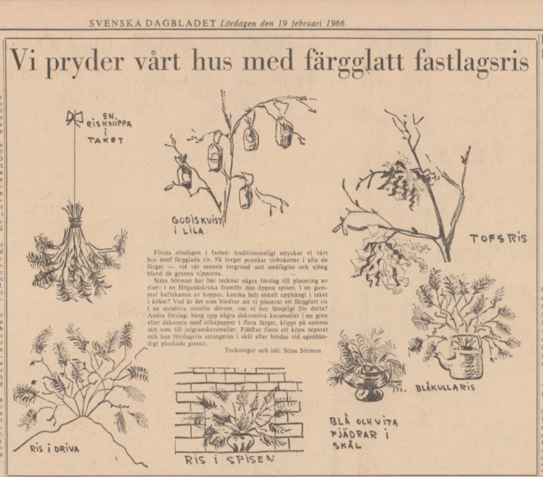 de i stockholmstrakten vanliga, inomhusdrivna och odekorerade påskrisen övertog fastlagsrisens pynt i form av mångfärgat dun.