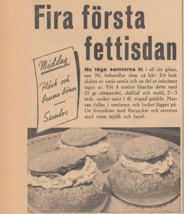 I ovanstående annons från första fettisdagen 1938 står det att semlorna ”översiktas med florsocker”. Att det fettisdagen 1938 kallas ”första” beror på att samtliga tisdagar under fastan räknades som fettisdagar då man fick äta semlor.