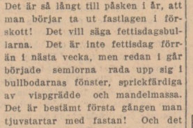 Men de yngre har inte samma fasta förankring för sina traditioner. /../ För vad är det egentligen för roligt med fastan om fastlagsrisen pryder hemmen månader i förväg? Vart tar tjusningen med den första fettisdagen vägen om man får äta sig mätt på semlor redan på lördagen innan och sedan på spridda veckodagar fastan igenom?