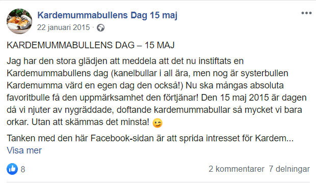 Kardemummabullens dag initierades 2015 som en Facebook-sida. Det var den 22 januari som en anonym användare skrev: ”Jag har den stora glädjen att meddela att det nu instiftats en Kardemummabullens dag (kanelbullar i all ära, men nog är systerbullen Kardemumma värd en egen dag den också!)”