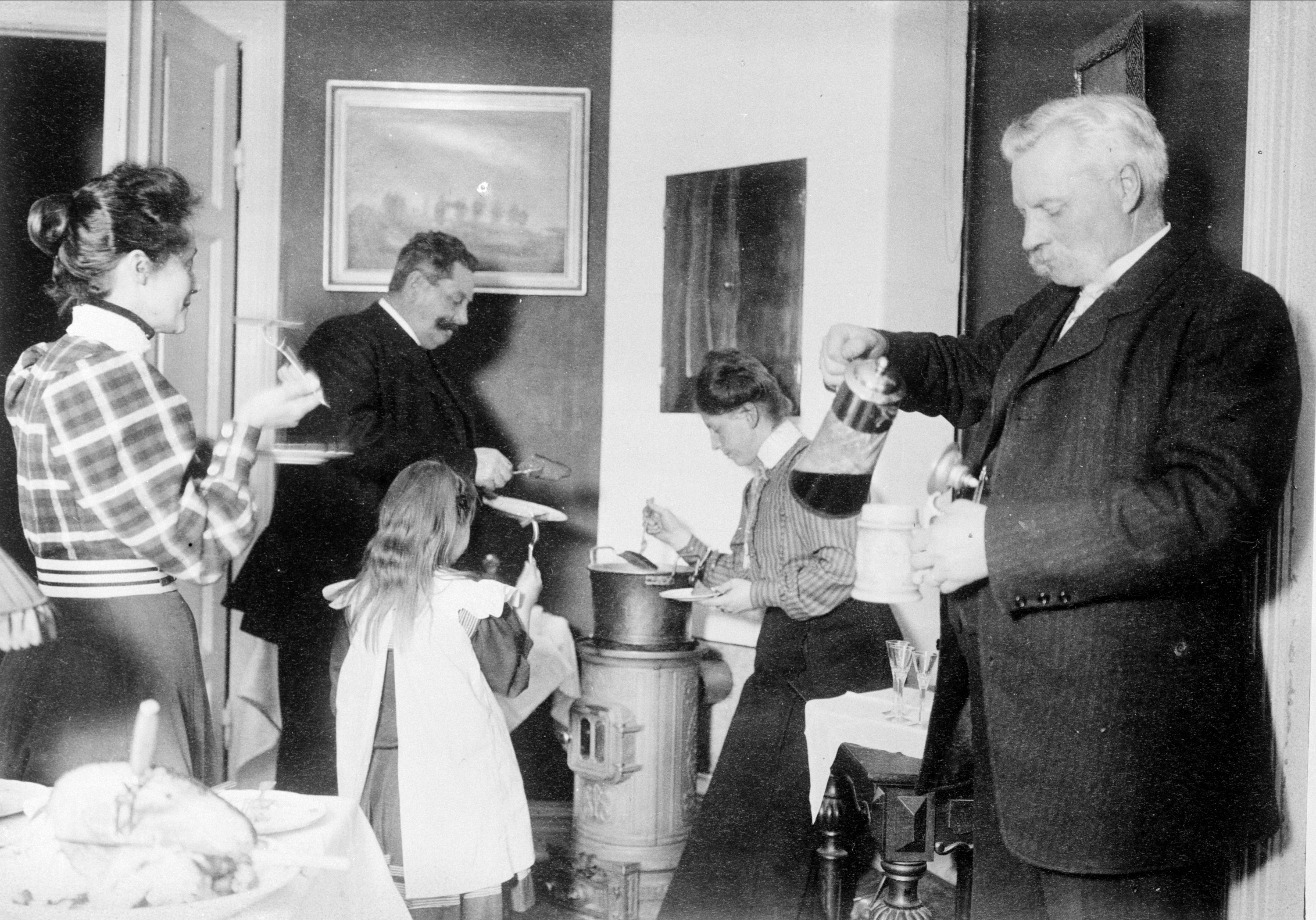 Ungdomen har väl hört talas om den gamla trefliga engelska julseden som består i att man hänger upp en mistelkvist i takkronan och sedan passar på och kysser flickorna när de råka komma under misteln. Om vi skulle ta och införa den julseden äfven hos oss! Det är ju merendels en smula stelt i början af våra julkalas innan ungdomen har kommit i gång med lekarna. Med en sådan där mistelkvist skulle all stelhet vara som bortsopad. Alla skulle bli lifvade genast. Söderlunds unge bror gjorde ett försök med det förra julen på ett kalas hos Söderlunds.