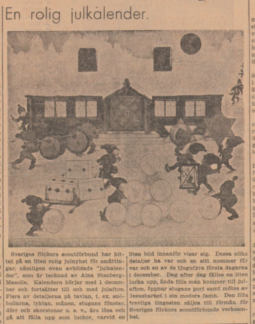 Sveriges flickors scoutförbund har hittat på en lite rolig julnyhet för småttingar, nämligen ovan avbildade ”julkalender”, som är tecknad av Aina Stenberg Masolle. Kalendern börja 1 december och håller på till och med julafton. Flera av detaljerna på tavlan t.ex. snöbollar, lyktan, månen, stugans fönster, dörr och skorstenar o.s.v., äro lösa och går att fälla upp som luckor, varvid en liten bild innanför visar sig.