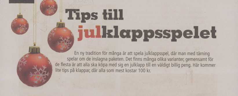 Att spela om julklappar är idag en etablerad tradition i många familjer. Om man läser tidningstext så är det äldsta beläggen för ”julklappsspelet” från 2003 och 2004. I Helsingborgs Dagblad 19 december 2003 skriver Pamela von Sabljar att: