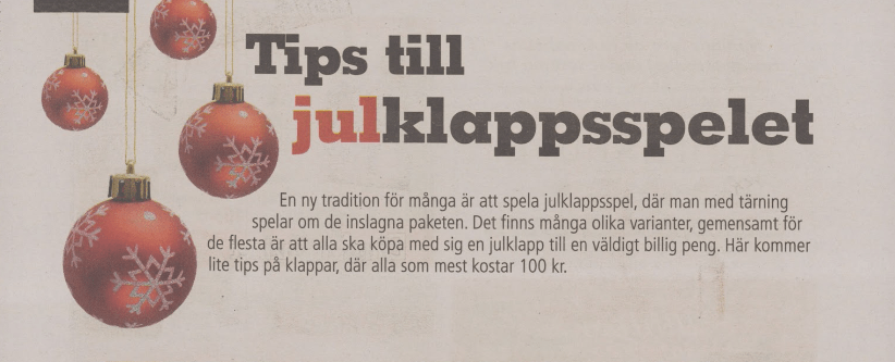 Så slutsatsen utifrån tidningsarkiven och min undersökning blir att julklappsspelet introducerades i Sverige under 2000-talet även om enstaka anekdotiska belägg finns från tidigare årtionden.