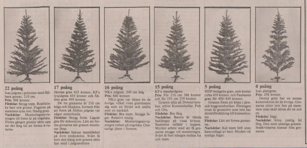 Två år senare skriver Kar de Mumma i ett kåseri att det blir ”rätt många julgranar över i år” eftersom ”folk skaffar sig plastgranar”. År andra sidan står det i samma tidning nästa jul: