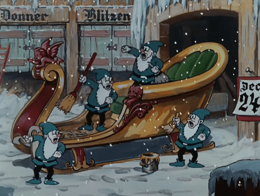 I den här scenen kan vi för övrigt se några av namnen på jultomtens renar – Donner och Blitzen. Sedan får vi också se de övriga renarna.