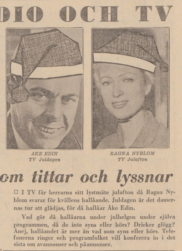 I TV får herrarna sitt lystmäte på julafton då Ragna Nyblom svarar för kvällens hallåande. Juldagen är det damernas tur att glädjas, för då hallåar Åke Edin.