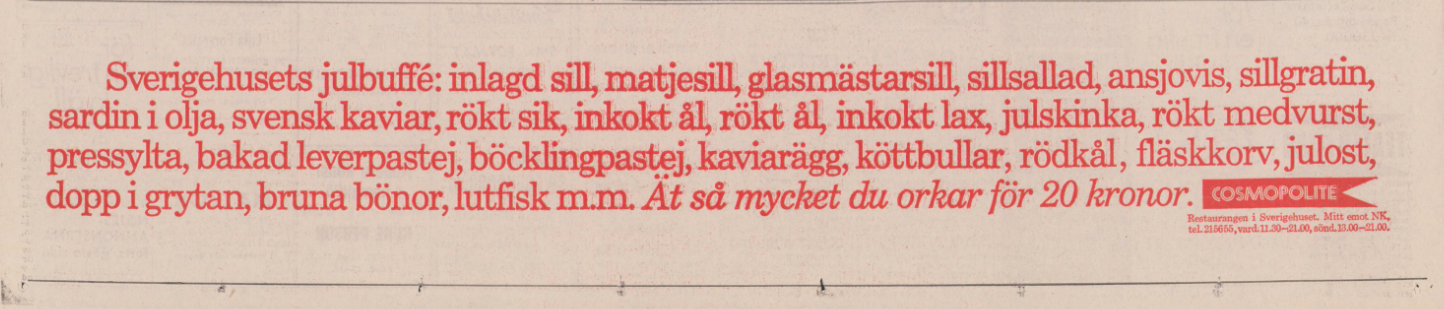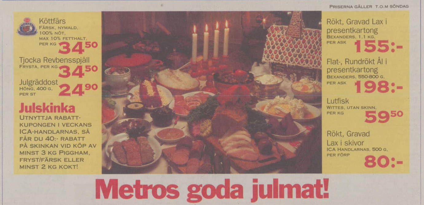 Restaurangskolans julbord 1991 ska vara ett ”ganska traditionellt och gammaldags julbord” och då ”har lax förstås också sin självklara plats på julbordet”. Året därefter skriver DN att ”laxen är på snabb frammarsch” som julmat, tillsammans med bl.a. köttbullar och prinskorv som båda blev del av julbordet under 1970- respektive 1980-talet.