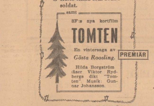 Det är Gösta Roosling, känd kortfilmare och upphovsman till ”Julottan” och Konfirmationen”, som har vågat sig på att omforma Viktor Rydbergs klassiska dikt ”Tomten” till en film. /../ Uppe i Älvrosgården togos på måndagen några scener till versraderna: Gå till visthus och redskapshus, känner på alla låsen”.